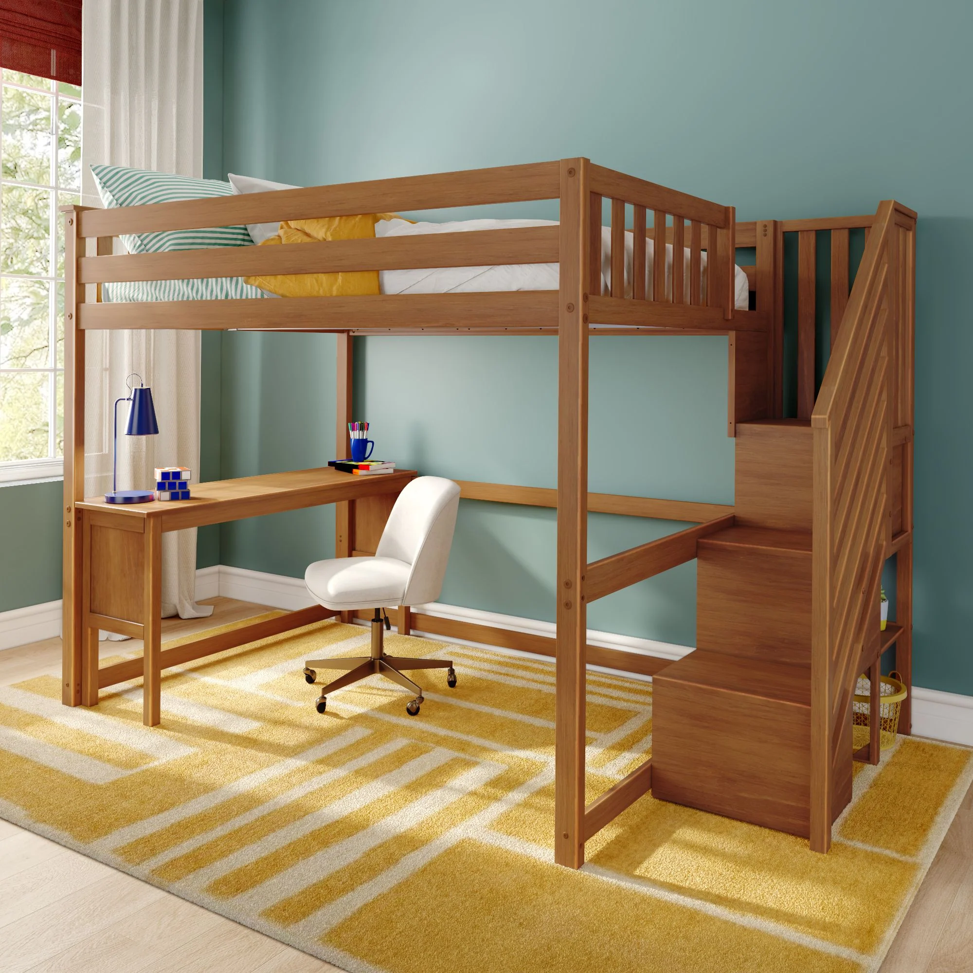 A perfect mix of fun and functional, our space-saving Full Loft Bed With Desk and Stairs creates the ultimate sleep and study space. Up above, stretch out and dream big in the full size bed. Down below, a spacious desk for studying and a world of underbed space for new adventures. With flexible layout options and safe, anti-slip stairs, this smart setup is a win-win for parents and kids alike!