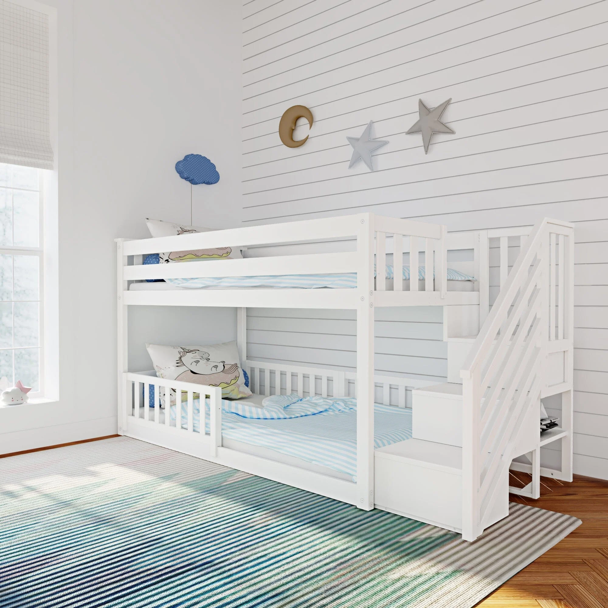Who says safety can’t be fun? Our Low Bunk Bed with Stairs & Guardrails is the ultimate safe choice for every room. The super comfortable staircase makes reaching the top bunk effortless. With guardrails for the bottom bunk, this bed takes safety to a whole new level.